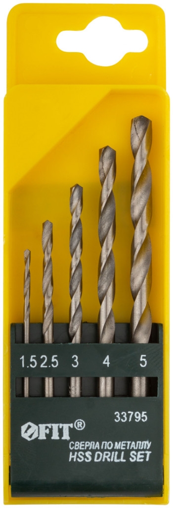 Набор сверл по металлу hss полированных, 5 шт. (1,5-2,5-3-4-5 мм).DIN 338. Цилиндрический хвостовик. Полированные. Угол заточки 118°. Класс точности А1. Материал: быстрорежущая (HSS) сталь. Упаковка: пластиковый бокс.