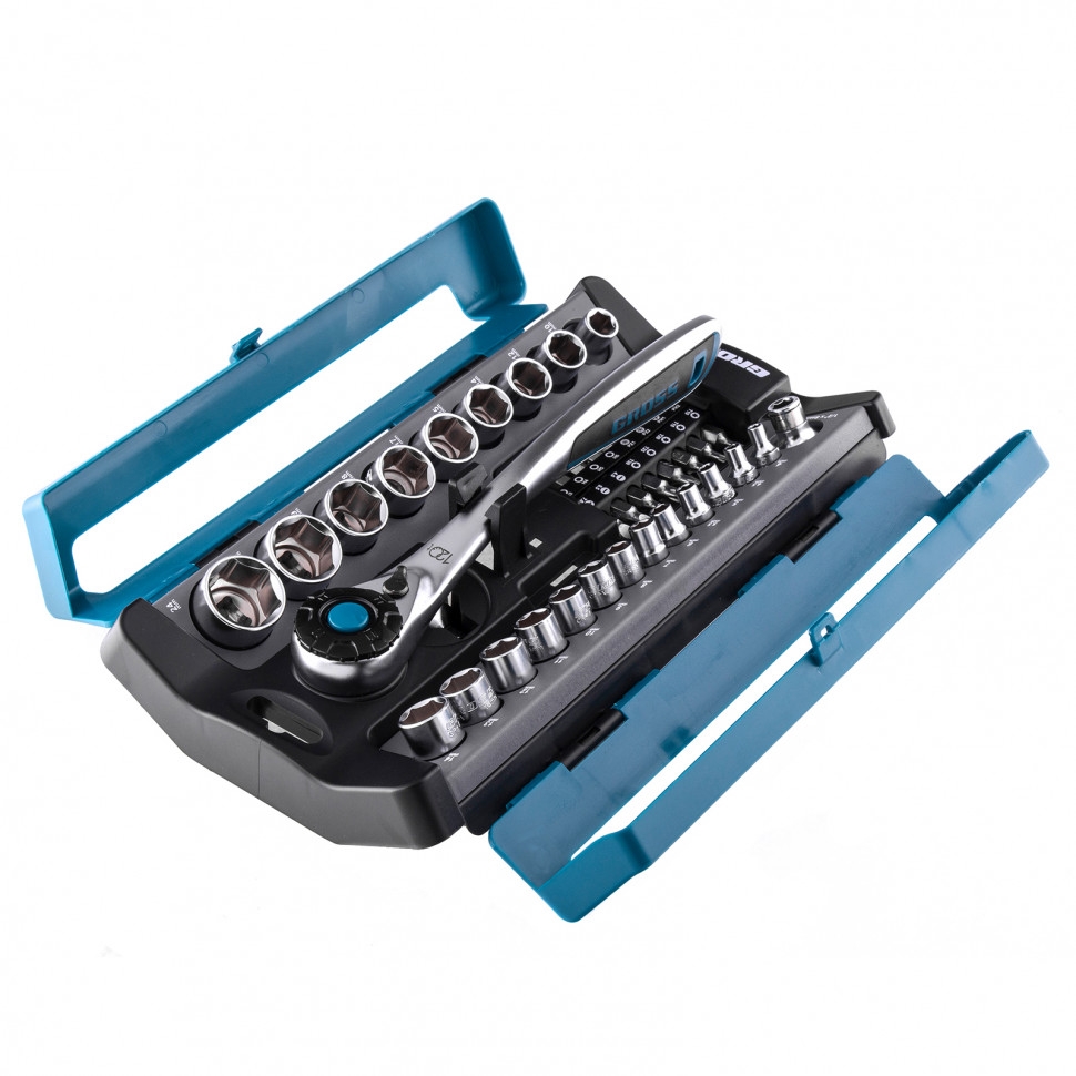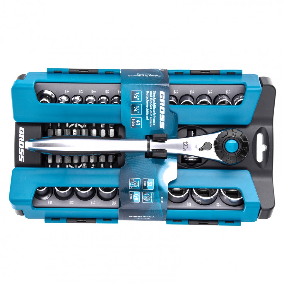 Набор Gross 14143 включает в себя 41 предмет из стали CrV-группы: ключ трещоточный 1/2 дюйма, переходник 1/2-1/4 дюйма, адаптер, 16 бит и 22 торцевые головки. Он применяется для монтажа и демонтажа резьбовых соединений при проведении технического обслуживания авто или для бытовых ремонтных работ. Набор подходит не только для самостоятельного использования в гараже и дома, но и для профессиональной эксплуатации на станциях техобслуживания.Преимущества Инструменты выполнены из качественной стали хромованадиевой группы, поэтому обладают высоким ресурсом, износостойкостью и антикоррозионными свойствами. Цельнокованная трещотка со 120 зубьями позволяет вращать крепеж максимально плавно и мягко, это делает удобной работу в труднодоступных и узких местах. Функция быстрого сброса на трещотке позволяет снять оснастку одним движением. С помощью реверса можно менять направление вращения трещотки для удобства работы. Комплект инструментов поставляется в пластиковом кейсе для удобства хранения и транспортировки.