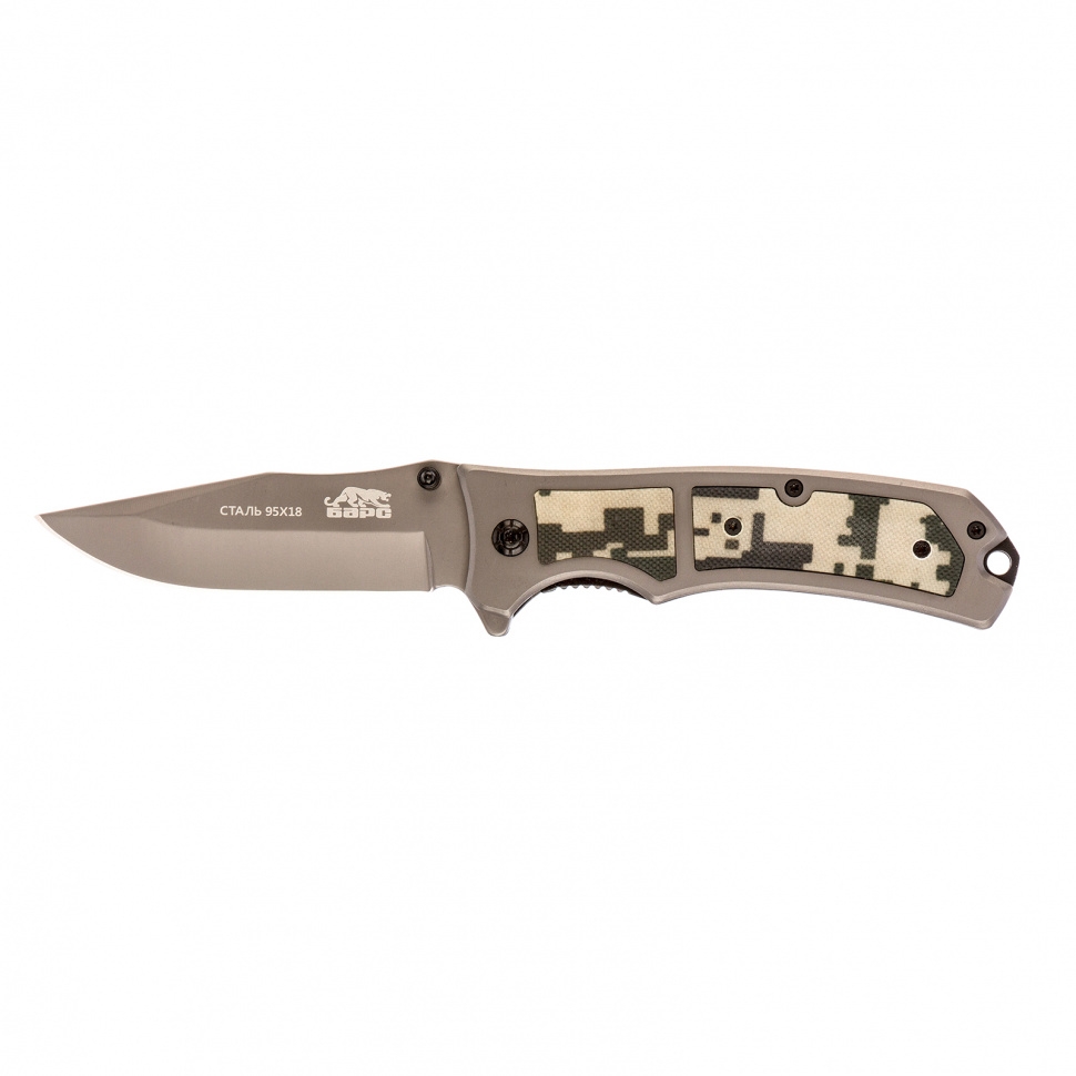 Высокий ресурс и коррозионная стойкость — лезвие ножа выполнено из стали 95Х18 твердостью 56-58 HRC с титановым покрытием.