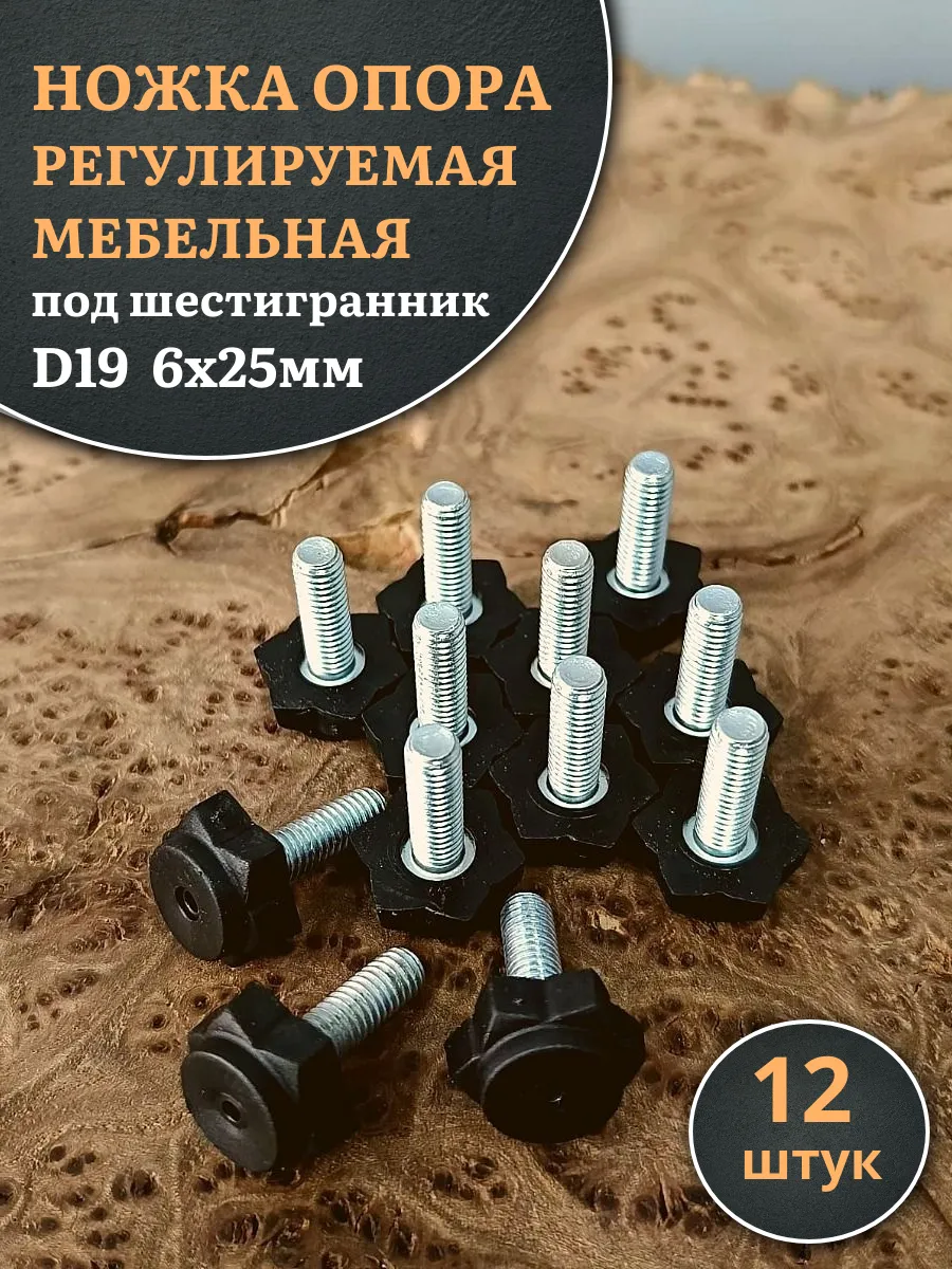Ножка опора D19 М6х25 регулируемая мебельная под шестигранник 12 шт