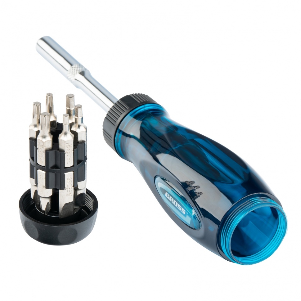 Реверсивная отвертка с удлинителем GROSS 12 шт. 11603 применяется для выполнения крепежных операций в местах с ограниченным доступом. Имеет большое количество насадок распространенных типоразмеров. Корпус изготовлен из прочного пластика, что повышает рабочий ресурс инструмента. Для удобства хранения насадки помещены в рукоятку.