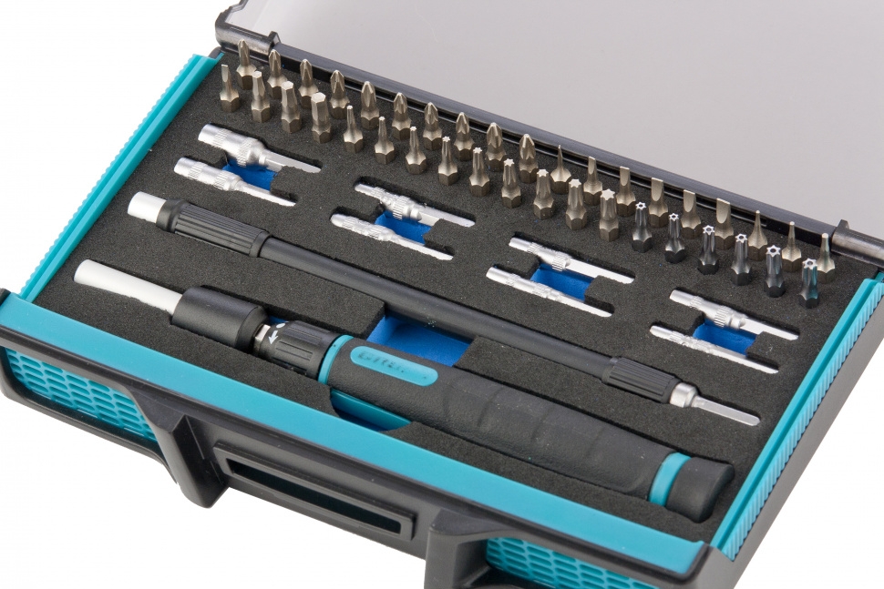 Отвертка с набором бит и торцевых головок GROSS 48 шт. 11599 пригодится для точных работ с мелкими крепежными элементами. Она имеет телескопический стержень и удобную рукоятку из нескользящего материала. Все биты из набора выполнены из качественной хромомолибденовой стали, обеспечивающей долгий срок службы. Твердость достигает 54-56 HRc.