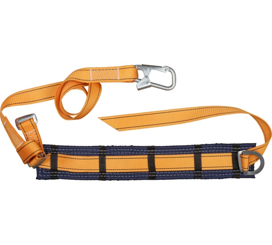 Пояс изготовлен из качественного материала и легко подгоняется под фигуру человека. Длина стропа вместе с карабином 1,45 м с допуском 50 мм. Статическая разрывная нагрузка: 1500 кг