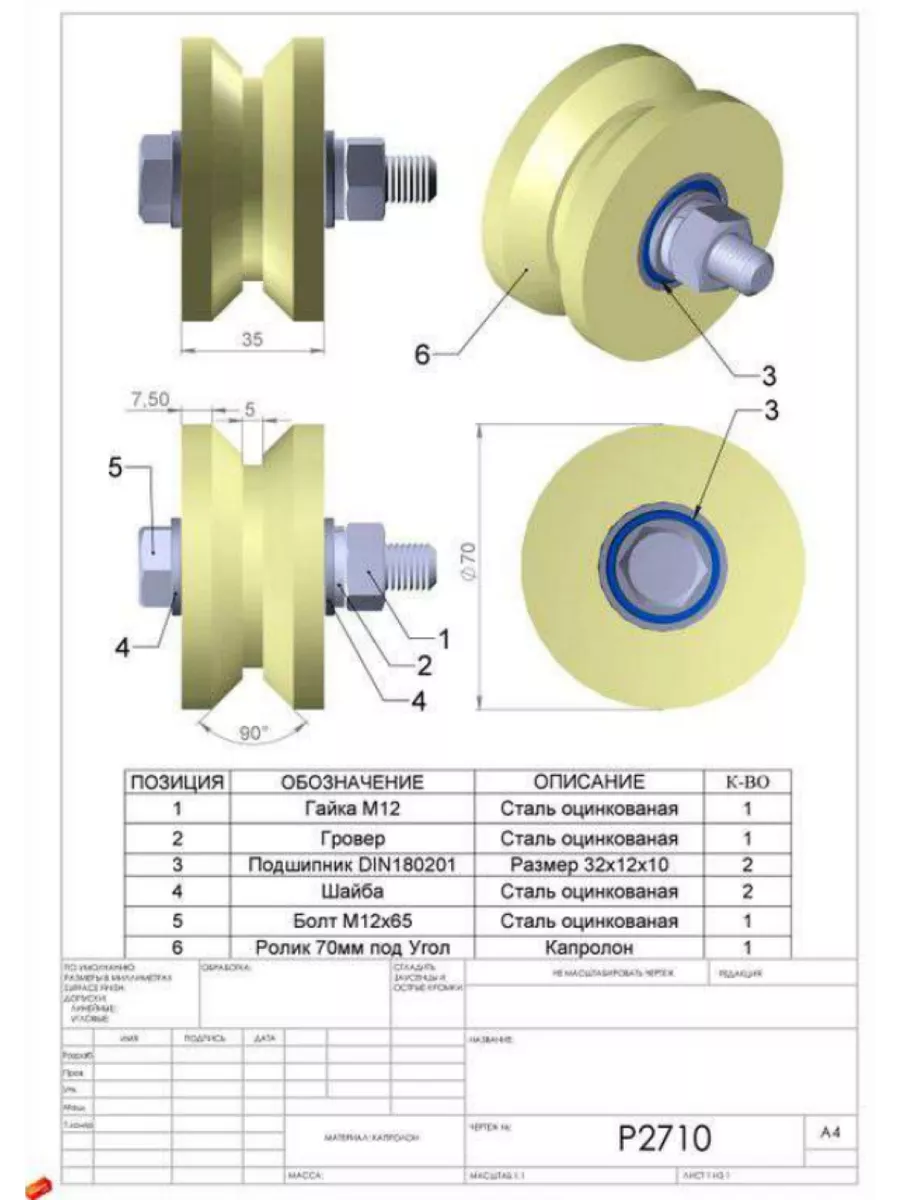Ролик для откатных ворот d70мм под угол ,капролон 4 шт.