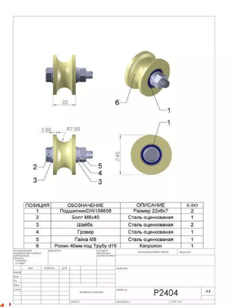 Ролик для ворот d 40 мм, под трубу d 15мм, капролон 4 шт
