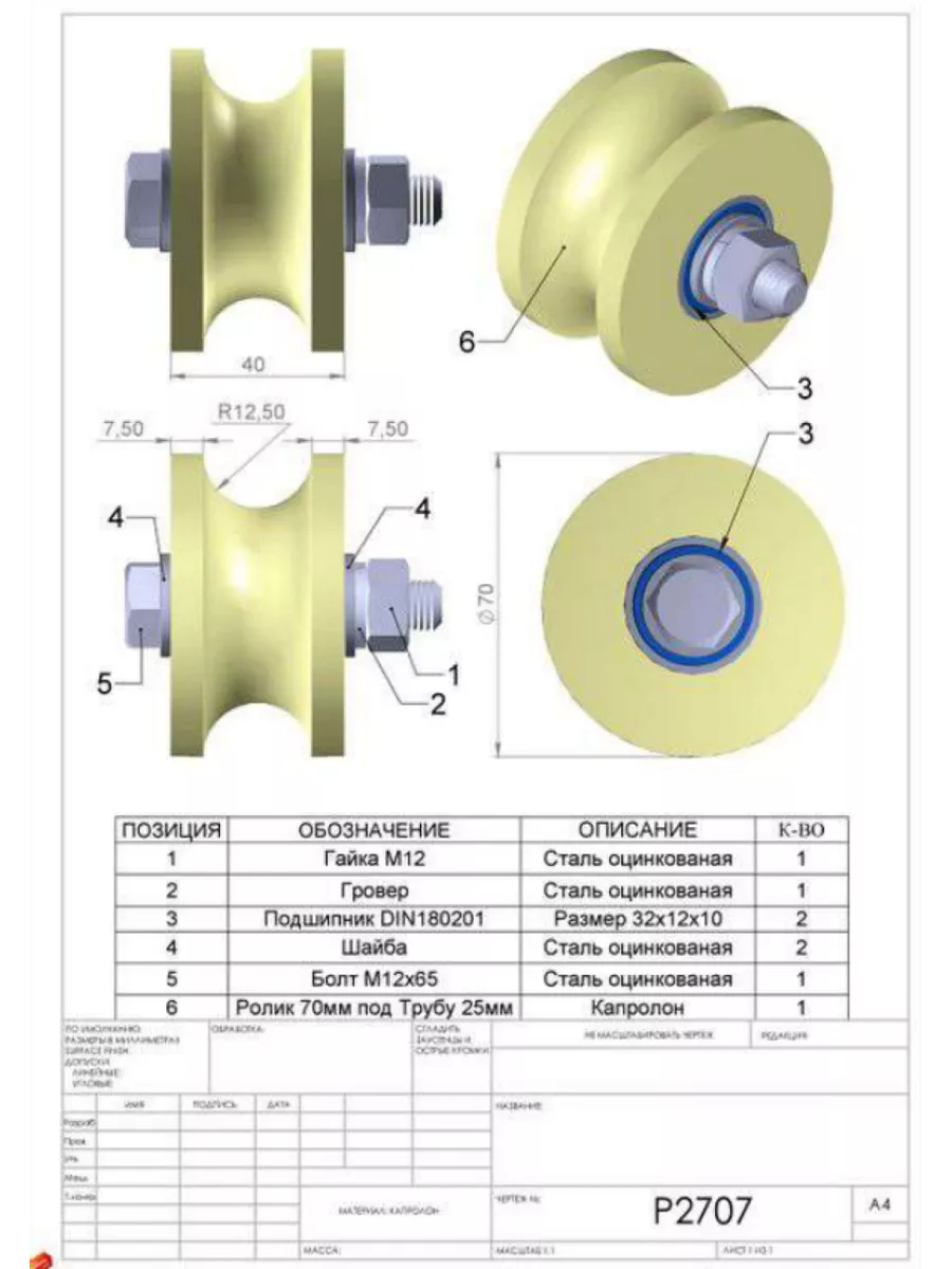 Ролик для ворот d 70 мм,под трубу 3/4 d25мм,капролон,4 шт