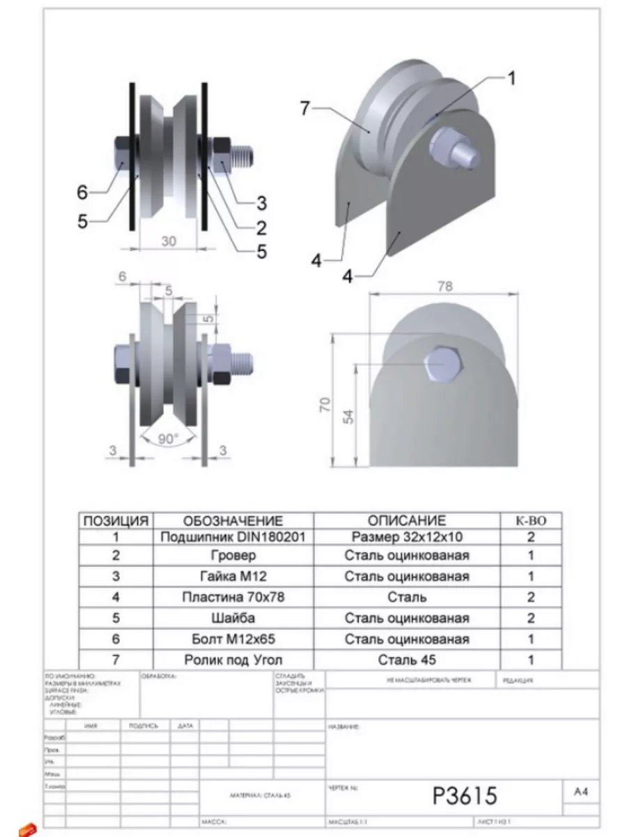 Ролик на пластинах d 65 мм под угол шир.30 мм ,металл, 4 шт.