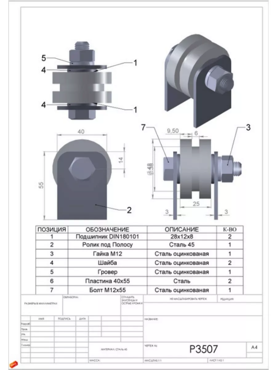 Ролик на пластинах Р3507, d50мм под полосу, металл, 2 шт.