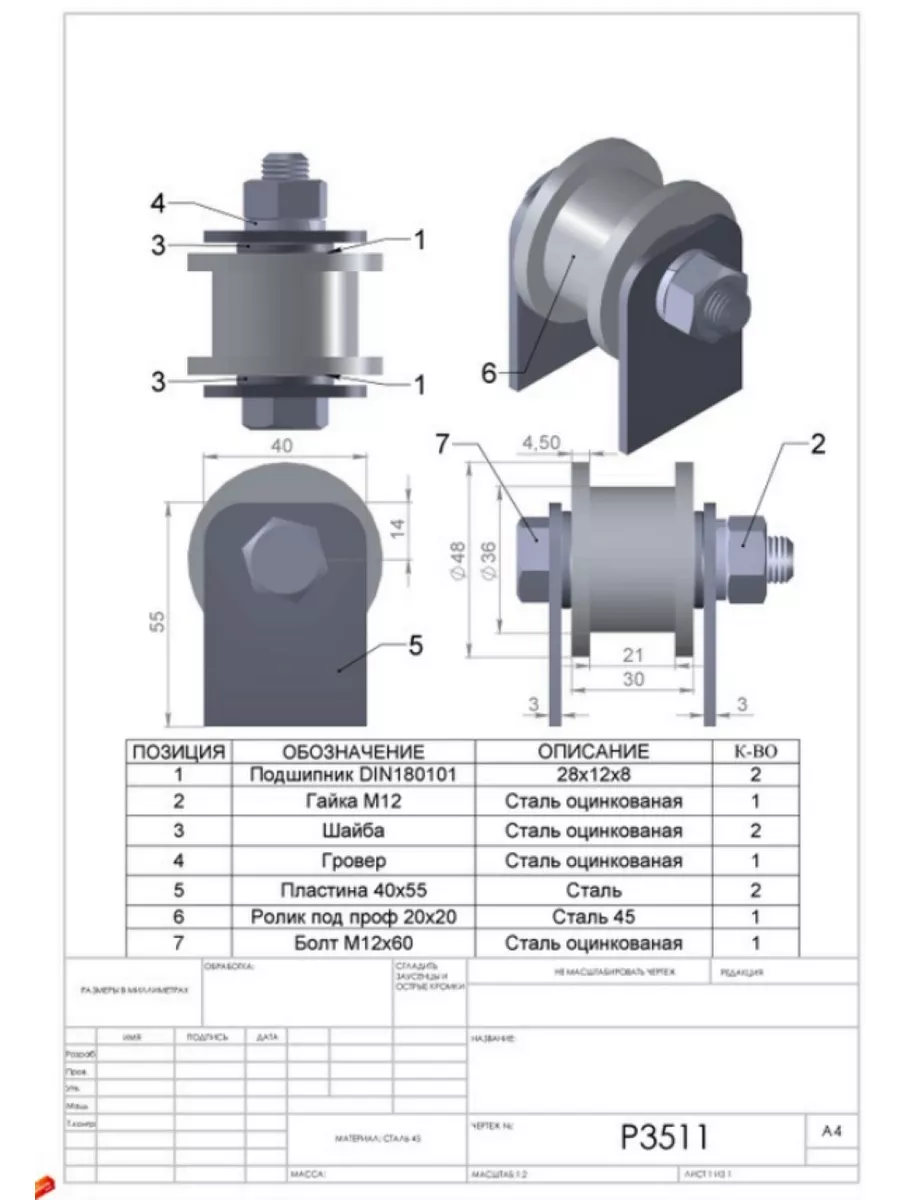 Ролик на пластинах Р3511, d50мм,под трубу 20х20,металл 2 шт.