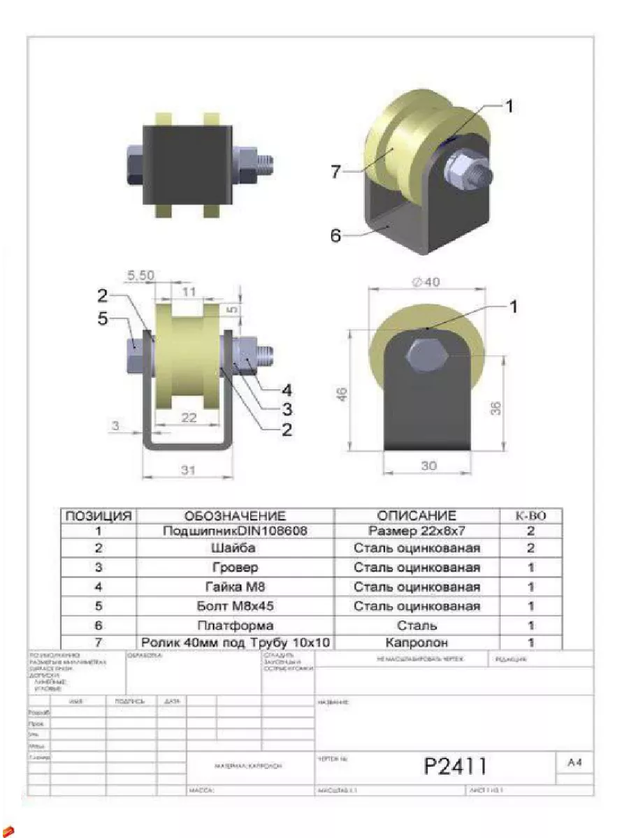 Ролик на платформе 2411, d40мм под трубу10х10,капролон 2 шт