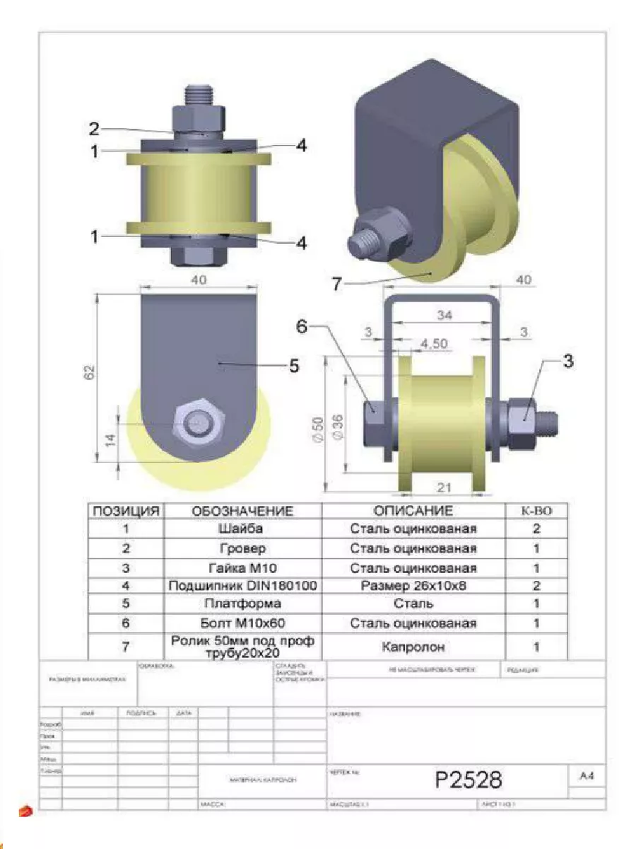 Ролик на платформе d 50 мм, под трубу 20х20,капролон 4 шт.