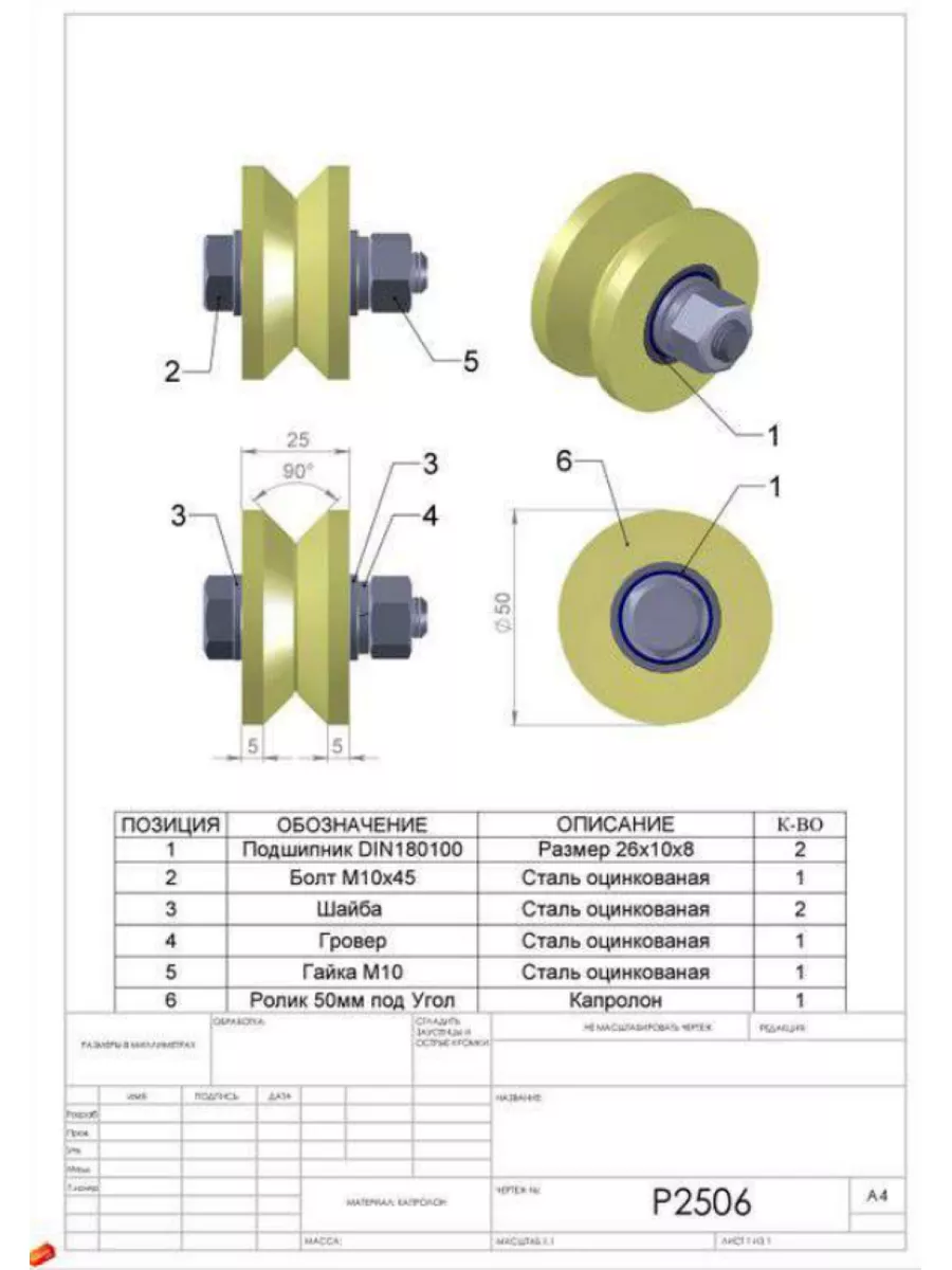 Ролик на платформе Р2506, d50мм , под угол , капролон 2 шт.