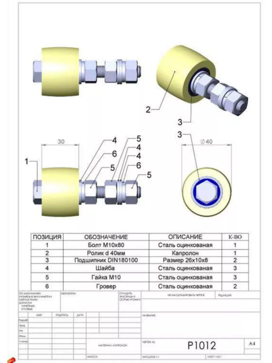 Ролик поддерживающий d 40 мм на болту М10, капролон, 4 шт.