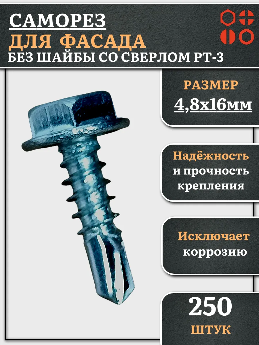 | Саморез без шайбы для фасада со сверлом 4,8х16 РТ-3, 250 шт. | сф4816фф250 | 1 шт. |
