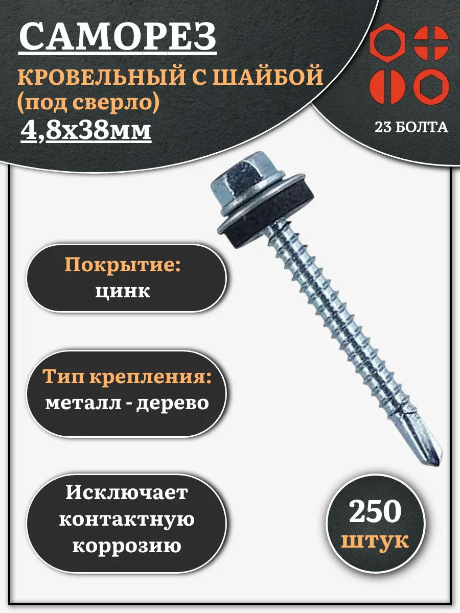 Саморез кровельный 4,8х38 мм с шайбой (под сверло),ОЦ 250шт.