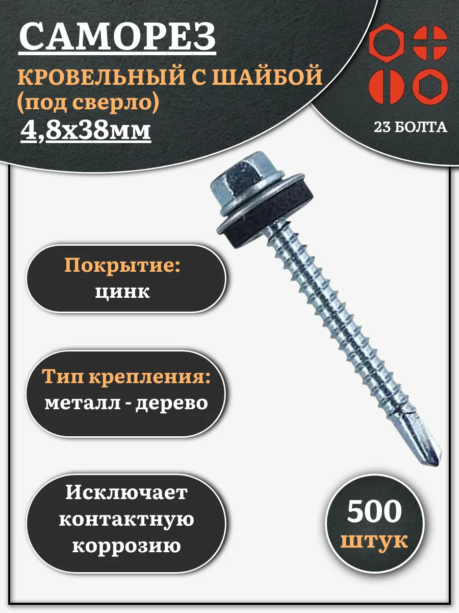 Саморез кровельный 4,8х38 мм с шайбой (под сверло),ОЦ 500шт.