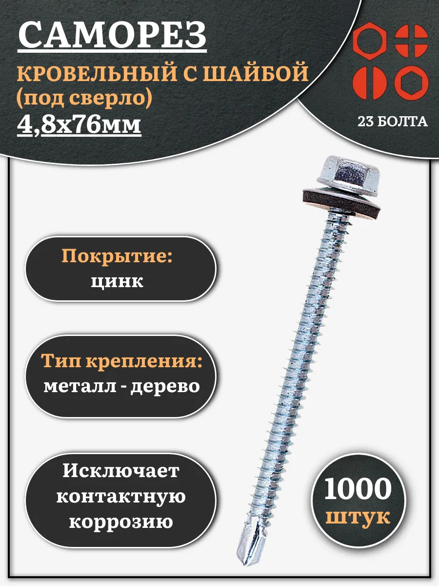 | Саморез кровельный 4,8х76 мм с шайбой (под сверло),ОЦ 1000шт. | B03004807634007ф1000 | 1 шт. |