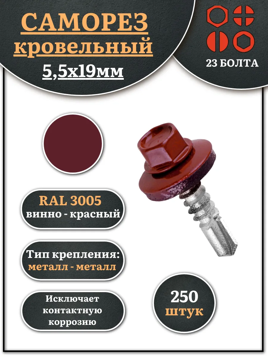 Саморез кровельный, 5,5х19 винно-красный RAL3005 250 шт