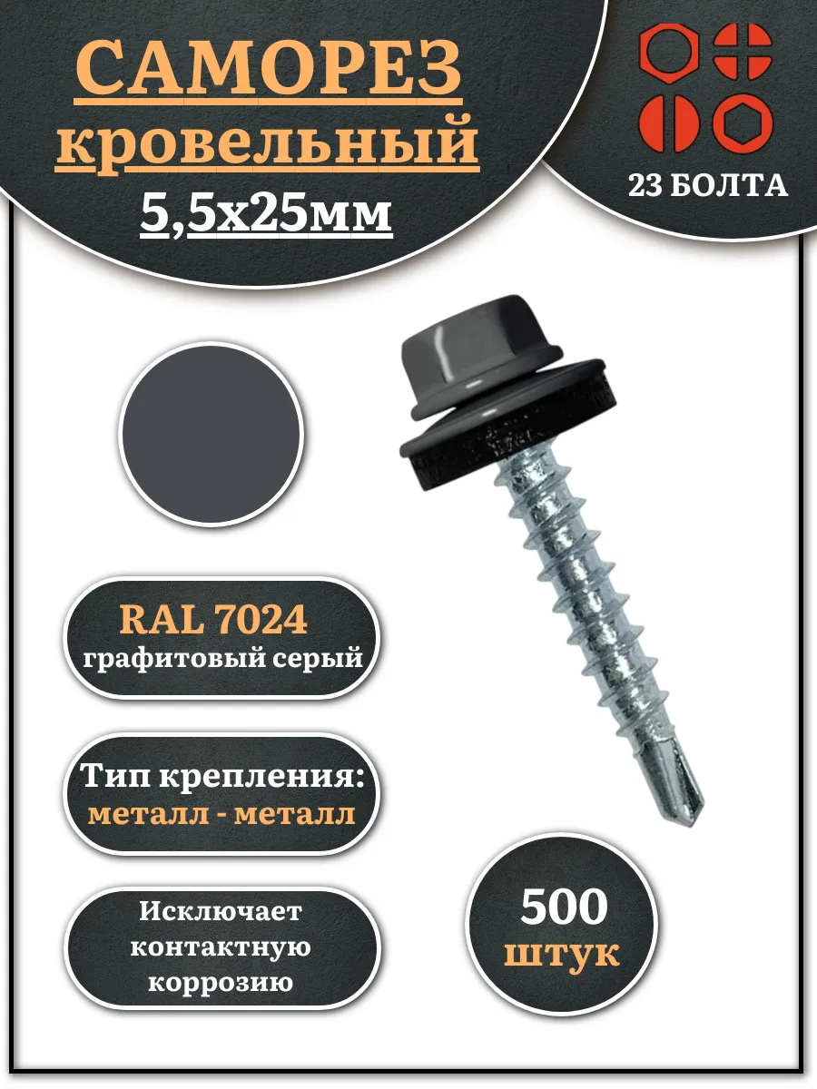 Саморез кровельный, 5,5х25 графитовый серый RAL7024 500 шт