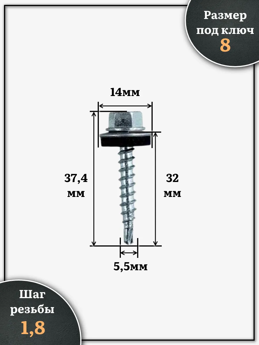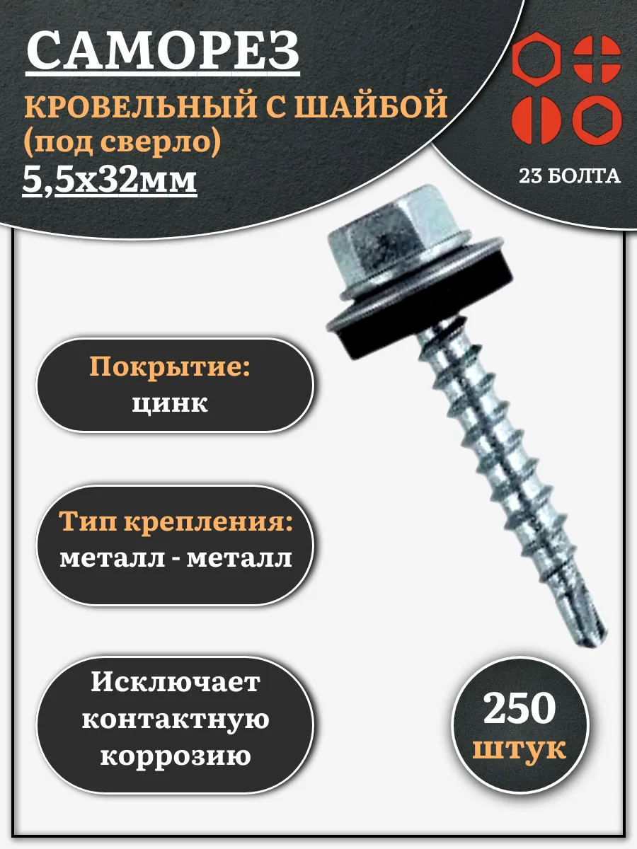Саморез кровельный 5,5x32 мм с шайбой (под сверло),ОЦ 250 шт