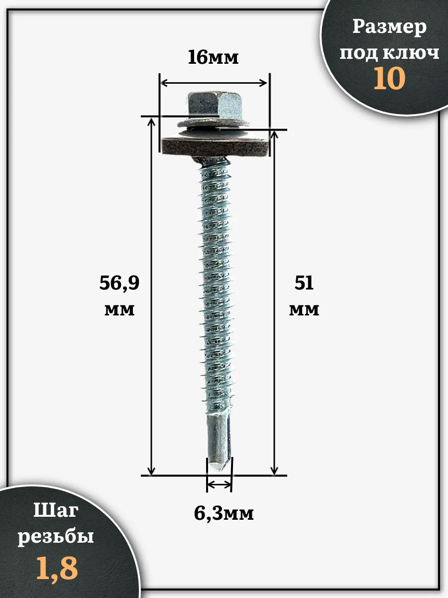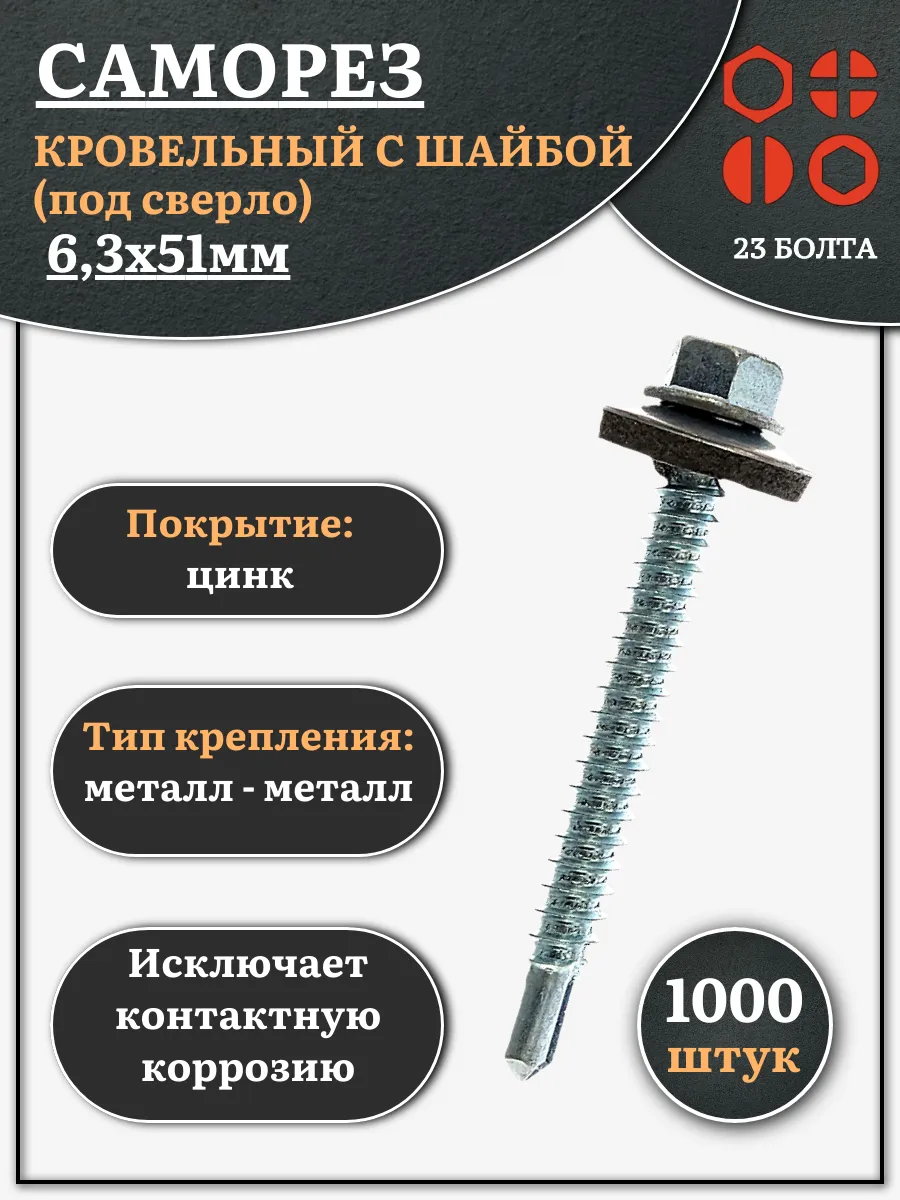 Саморез кровельный 6,3х51 мм с шайбой (под сверло),ОЦ