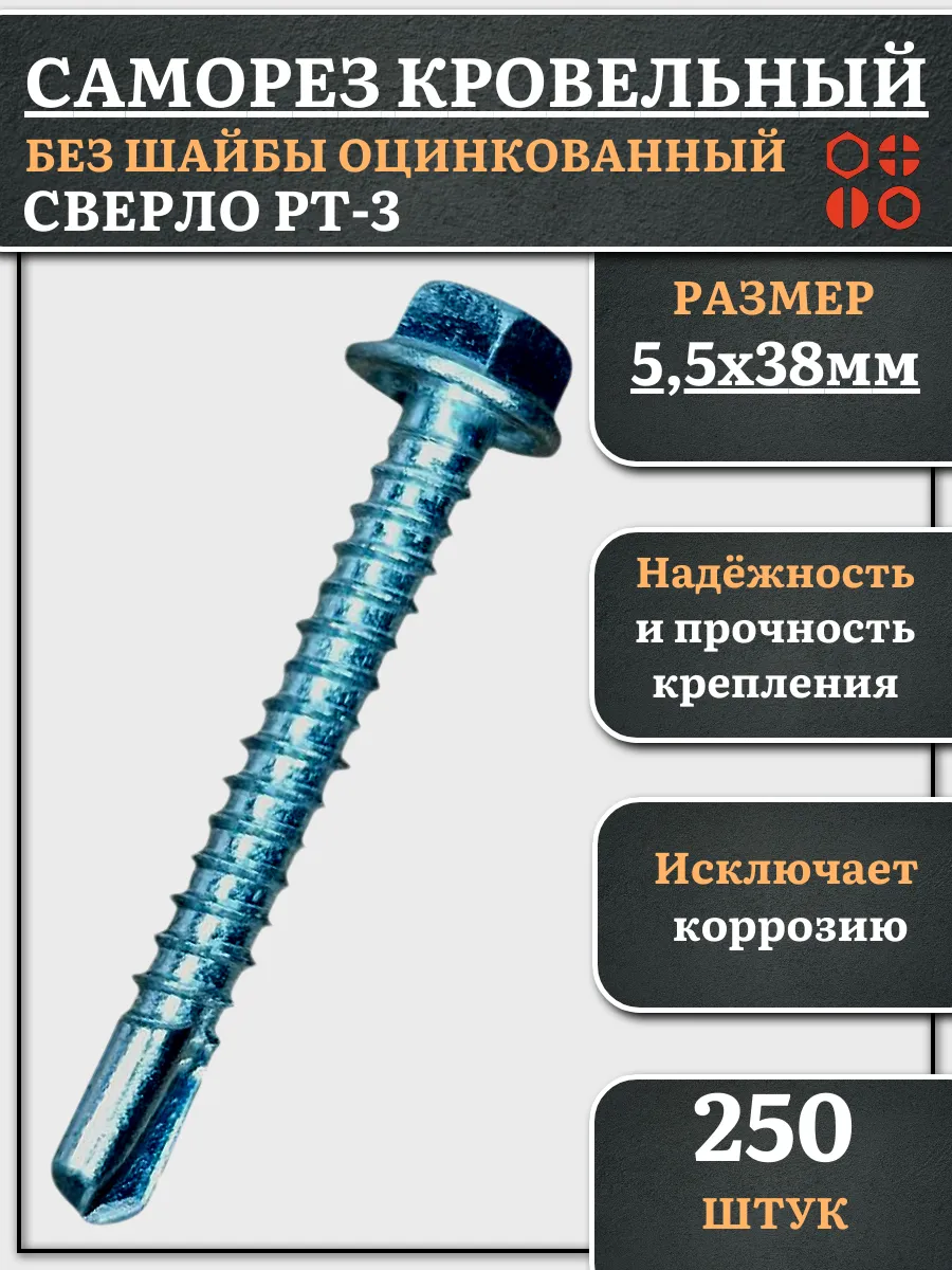 Саморез кровельный без шайбы, 5,5х38 ОЦ сверло РТ-3, 250 шт.