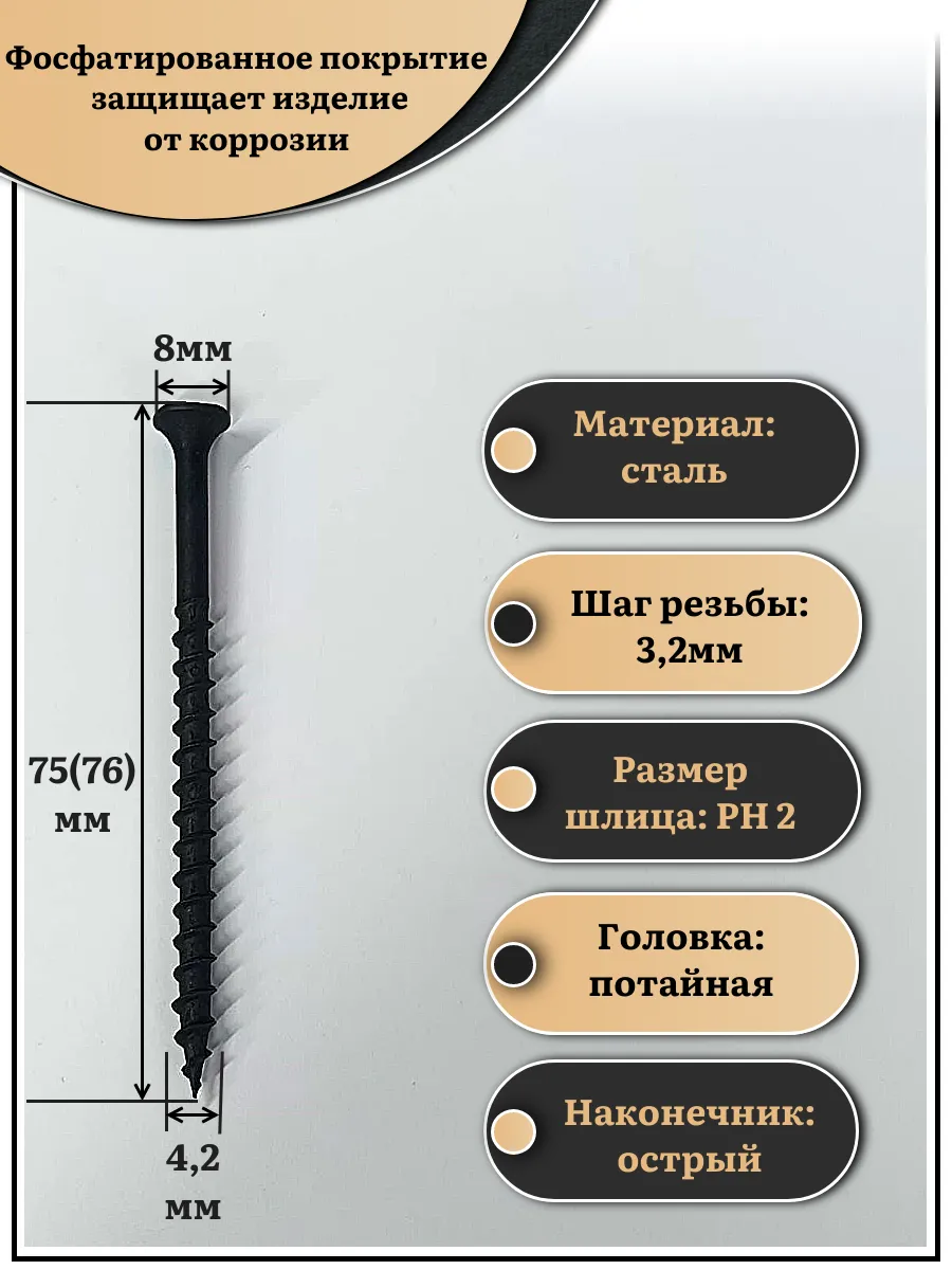 Саморез шуруп по дереву 4,2х75(76) крупная резьба, чёрный 50 шт.