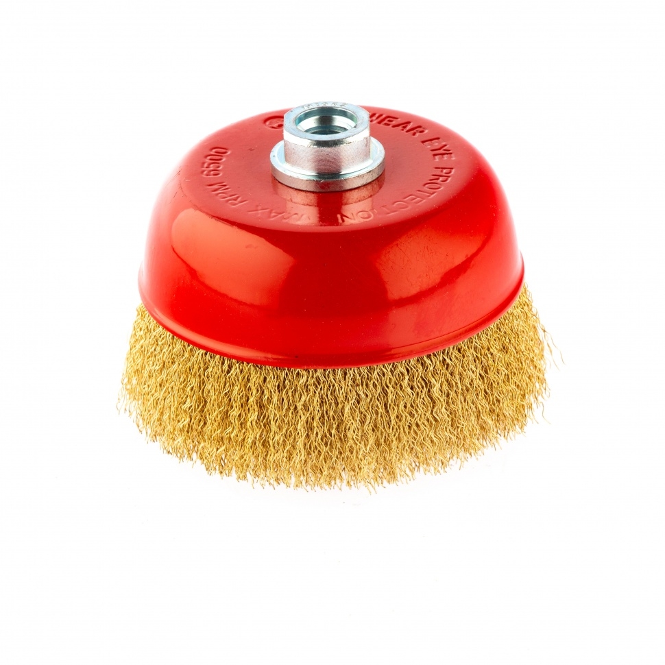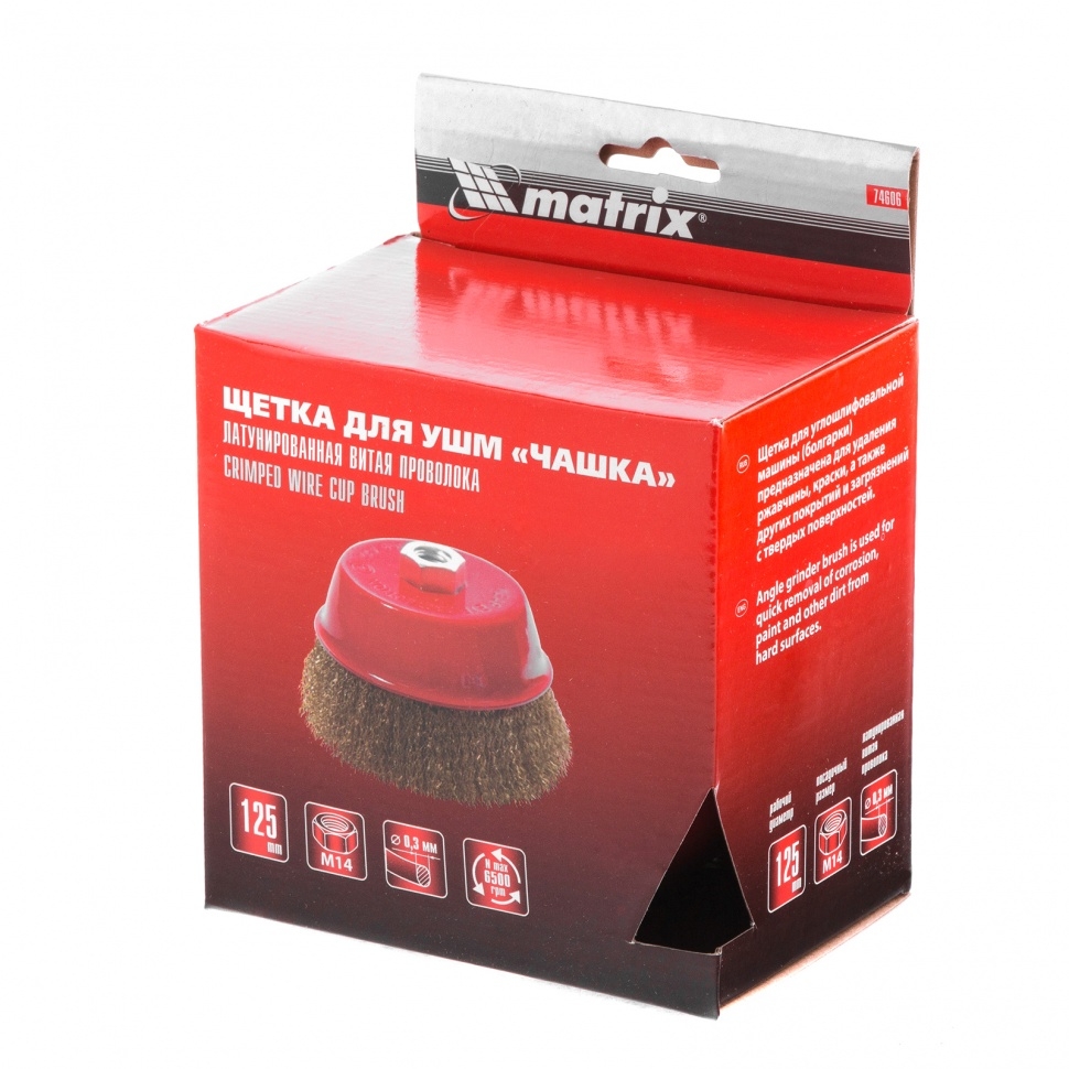 Щетка «чашка» Matrix 74606 125 мм с латунированной витой проволокой устанавливается на вал УШМ с помощью гайки М14. С ее помощью можно обработать поверхности для снятия тонкого слоя краски или лака, удаления ржавчины и загрязнений. Чашкой диаметром 125 мм можно быстро обработать большие площади при рекомендованных оборотах 6500 об/мин. Преимущества Долговечность — щетина выполнена из высококачественной стальной проволоки. Универсальность — набор подходит для любых твердых поверхностей: древесины, металла, пластика и т.д. Аккуратная работа — щетки с витой щетиной позволяют снять тонкий слой материала. Коррозионная стойкость — корпус щетки покрыт защитной эмалью, щетина латунирована.