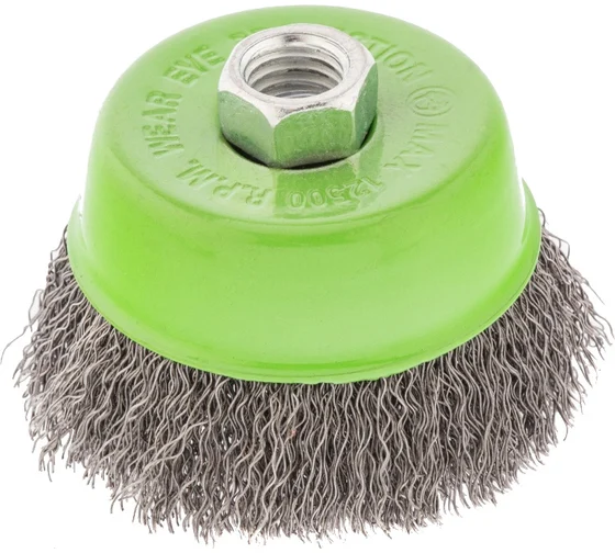 Щетка для УШМ Сибртех «чашка» 746047, М14, диаметром 75 мм, с щетиной из витой проволоки 0,3 мм, предназначена для постепенного снятия тонкого слоя материала с металлических, деревянных и пластиковых поверхностей. Удаляет ржавчину, загрязнения, а также остатки краски и других покрытий. Подходит для обработки участков значительной площади. Щетку устанавливают на вал углошлифовальной машины (УШМ), рекомендуемая максимальная скорость вращения 12500 об/мин. Работать с оснасткой следует в спецодежде.
