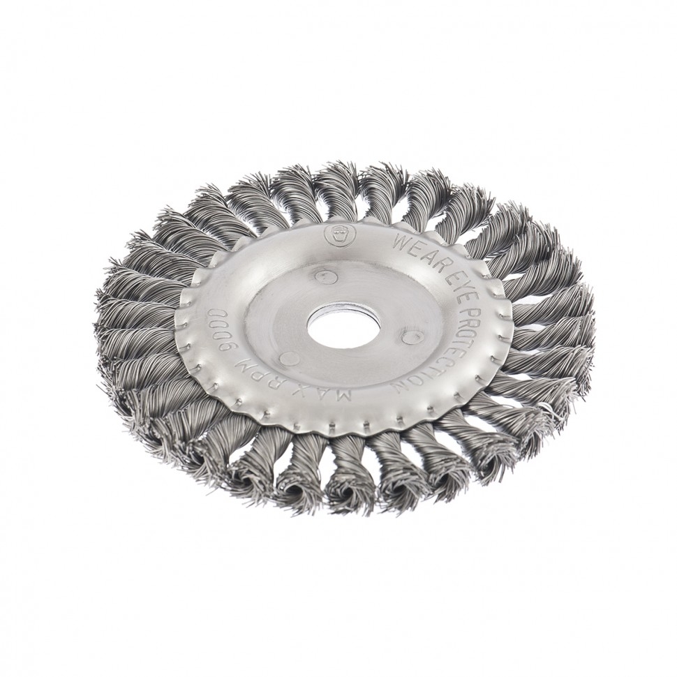 Плоская щетка Matrix 74634 диаметром 150 мм и посадкой 22,2 мм, с крученой проволокой 0,5 мм, устанавливается на вал УШМ. Щетина с крученой проволокой эффективно удаляет толстый слой ржавчины, лакокрасочных материалов и загрязнения с поверхностей при проведении грубой (черновой) обработки. Плоская форма позволяет обрабатывать труднодоступные места, в т.ч. углы и изгибы. Рекомендуется использовать щетку на оборотах не более 9000 об/мин. Преимущества За счет высококачественной нержавеющей проволоки обеспечивается долговечность щетины. Универсальная щетка рассчитана на обработку твердых поверхностей из любых материалов: металла, древесины, цветных металлов, пластика и т.д. Щетку можно использовать вне помещений, т.к. щетина покрыта маслом, а корпус оцинкован.