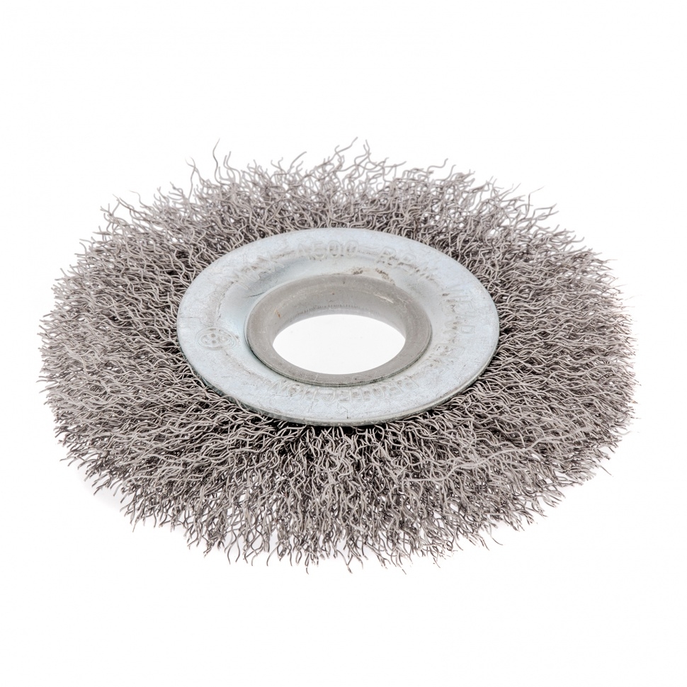 Плоская щетка для УШМ Сибртех 746487 диаметром 100 мм, с посадкой 22,2 мм, с щетиной из витой проволоки, предназначена для щадящей очистки твердых поверхностей от загрязнений, ржавчины, остатков краски и других покрытий. Щетина из проволоки толщиной 0,3 мм постепенно снимает тонкий слой материала. Плоская форма щетки делает ее оптимальным инструментом для обработки внутренних углов, пазов, изгибов и малодоступных мест. Щетка позволяет придать шероховатость или подчеркнуть структуру материала. Насадка устанавливается на фланец углошлифовальной машины и подходит для продолжительной работы, не требующей частой смены оснасток. Рекомендуемая максимальная скорость вращения составляет 4500 об/мин. Для обеспечения безопасности оператора следует использовать средства индивидуальной защиты. Щетка применяется в строительной, производственной сфере, а также в быту. Преимущества Благодаря витой проволоке щетина хорошо держит форму. Проволока из высококачественной стали обеспечивает щетке высокий ресурс работоспособности