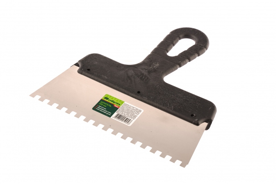 Шпатель Сибртех из нержавеющей стали, с пластмассовой ручкой и зубьями применяется для равномерного нанесения клея при укладке мелкоформатной плитки, мозаики и т.д. Квадратные зубья облегчают нанесение клеевого состава, позволяя ровно и экономно распределять его по поверхности. Зубья размером 6 х 6 мм рассчитаны на плитку площадью 100-400 см2.Упругое полотно — при изгибающих нагрузках шпатель быстро восстанавливает свою форму.