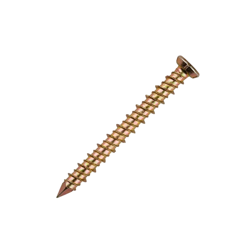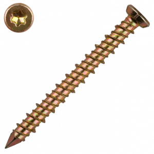 Саморез-шуруп "Бетон Нагель" с потайной головкой, с насечками и шлицем TORX. Шуруп широко используется в строительстве и при проведении ремонтно-отделочных работ. Часто применяются для крепления оконных рам и дверных коробок. Данный саморез изготавливается из стали и потом покрывается желтым цинком. По всей длине стержня расположена острая попеременная резьба. Шуруп имеет острый наконечник и потайную шляпку. Для работы с данной моделью шурупа необходима бита TORX. Материал основания: бетон, природный камень, кирпич.