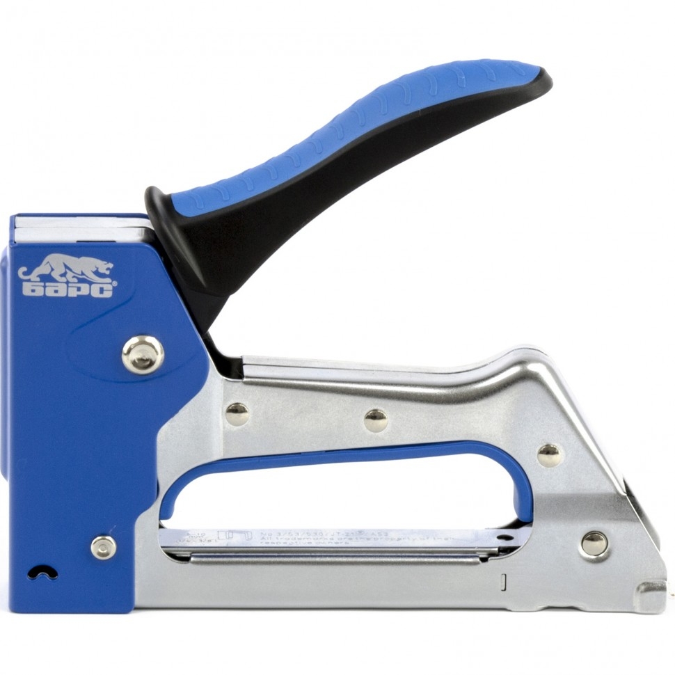 Металлический степлер Барс 40002 с двухкомпонентной рукояткой, для скоб типа 53 размером 6-10 мм, используется для сборки и обивки мебели, фиксации изоляционных материалов, а также других монтажных и отделочных работ. Позволяет быстро соединять с деревянным основанием листовые материалы из ДВП, ДСП, картона, оргалита, фанеры, пленки ПВХ. Благодаря рессорному ударному механизму инструмент не требует от оператора значительных усилий, поэтому подходит для длительной работы.