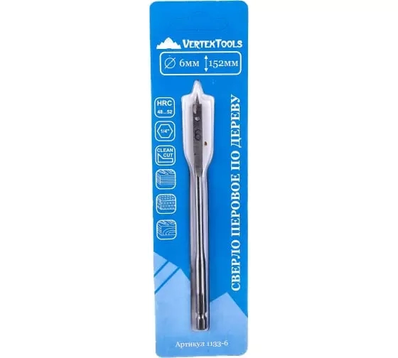 Сверло по дереву перовое Vertextools 1133-6 с шестигранным хвостовиком предназначено для дрелей, шуруповертов. Подходит для работы с древесиной, ДСП, МДФ, фанерой, гипсокартоном. Сверло изготовлено из инструментальной стали, закаленной в рабочей части. Оснащено очерчивающим остриём, что позволяет получить ровное, цельное отверстие. Шестигранный хвостовик обеспечивает надежное закрепление в патроне. Перовое сверло имеет высокий коэффициент производительности и позволяет выполнить отверстия различного диаметра. Для получения наилучшего результата и чтобы продлить период эксплуатации, соблюдайте правила: Начинайте сверлить на малых оборотах дрели постепенно добавляя, но не более 300-450 об/мин. Такой подход позволяет добиться более качественных результатов и сохраняет сверло от деформации. Устанавливайте сверло выдержав угол в 90.