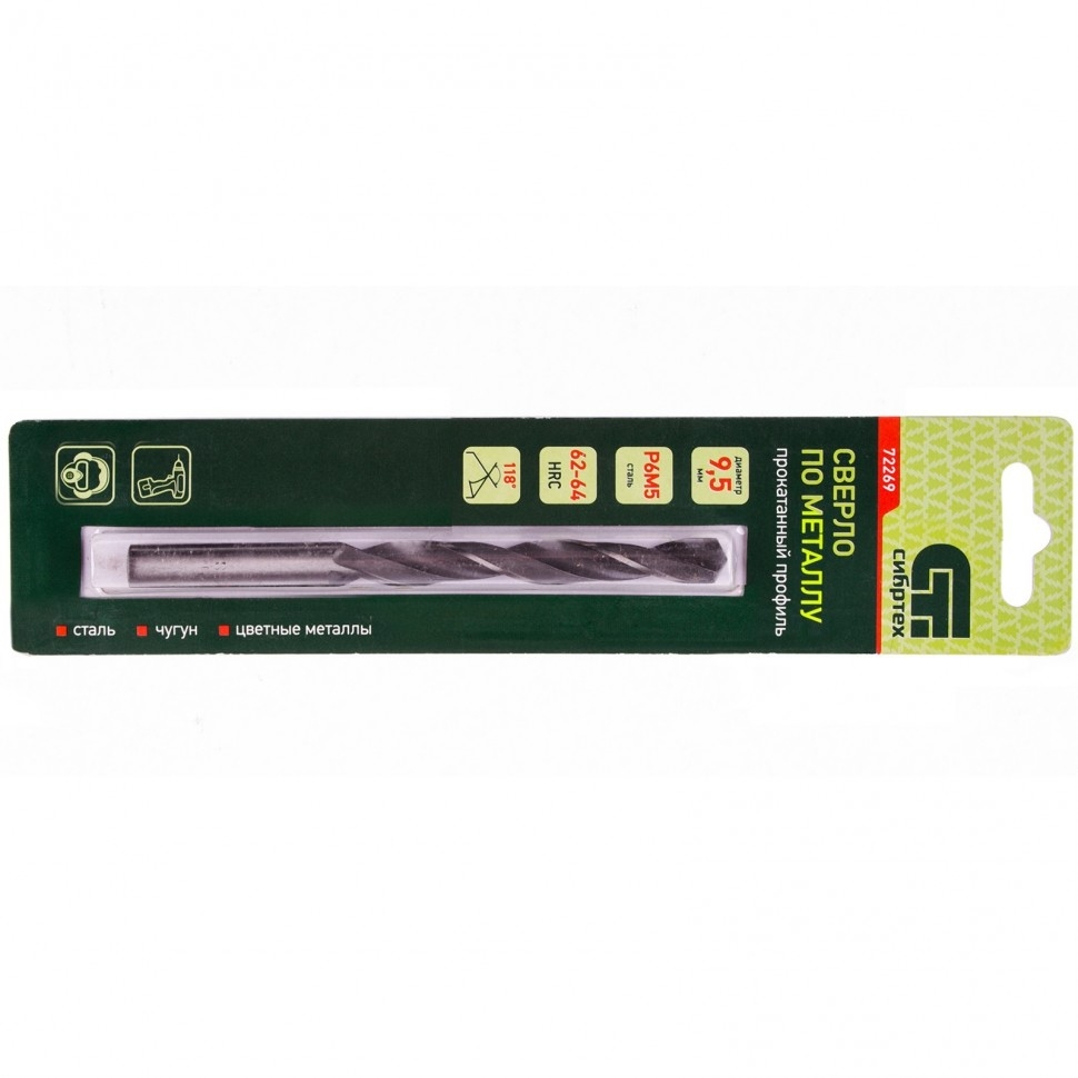 Сверло по металлу Сибртех 72269 из стали P6M5 имеет угол заточки 118 градусов и позволяет получать отверстия диаметром 9,5 мм в черных и тяжелых металлах, в том числе стали, чугуне и твердой бронзе. Сверло отличается наиболее выгодной стоимостью по сравнению с другими моделями из стали P6M5. Используется для монтажно-сборочных работ, будет полезно в быту. Сверло изготовлено из быстрорежущей стали, легированной вольфрамом и молибденом, поэтому устойчиво к динамическим нагрузкам и перегреву.