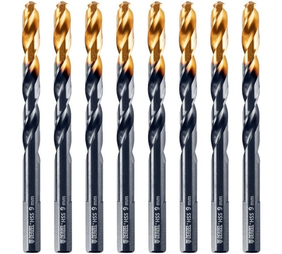 Сверло по металлу Golden Tip 9 мм, HSS-Tin, 8 шт, DIN 338 Denzel 717221 предназначено для сверления сквозных и глухих отверстий в легированной и нелегированной стали, железе, чугуне, листовом и цветном металлах, пластмассе.