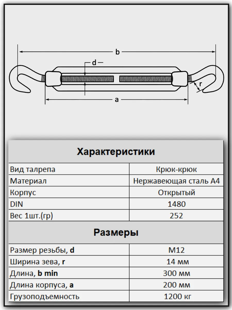 | Талреп крюк-крюк нержавеющий А4 М12 DIN1480, 1 шт. | A4BJ11200091A07ф1 | 1 шт. |
