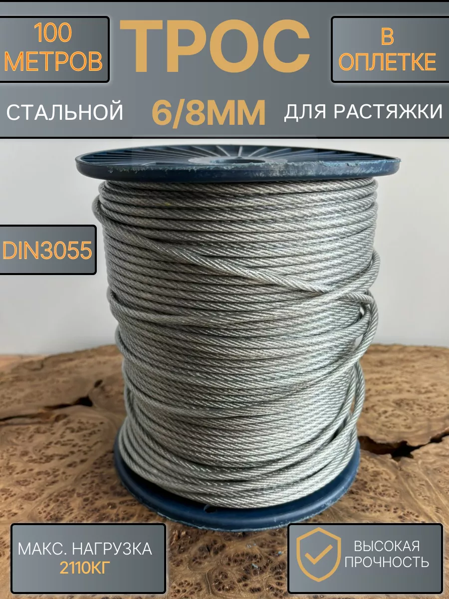 Трос стальной для растяжки 6/8мм 100м в оплетке ПВХ DIN305