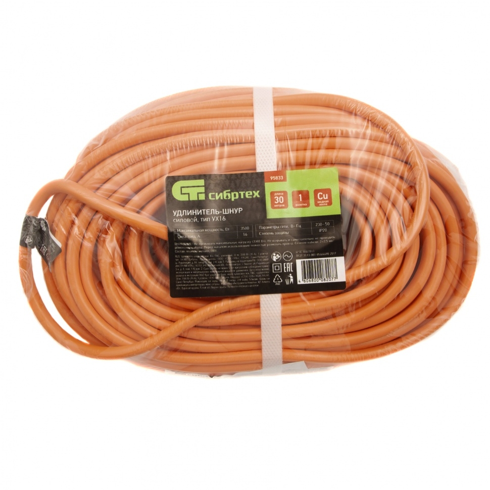 Удлинитель-шнур силовой, б/з, ПВС, усилен., 30 м, 3500 Вт, (16А), 1 розетка, тип УХ16 Сибртех