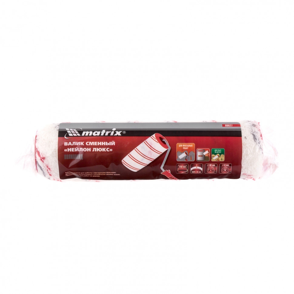 Сменный валик Matrix 80627 «Нейлон Люкс» с полиамидным ворсом длиной 18 мм и диаметром ролика 48 мм подходит для бюгелей 8 мм. Он предназначен для нанесения любых типов лакокрасочных материалов на грубые неровные поверхности. Ширина 250 мм позволяет эффективно и быстро окрашивать большие площади: стены, потолки, фасады и т.д. За счет длины 18 мм ворс прокрашивает самые труднодоступные места, обеспечивая высокое качество окраса.