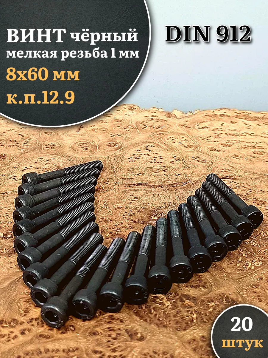 Винт мелкая резьба чёрный к.п.12.9 8х60х1 DIN912, 20 шт.