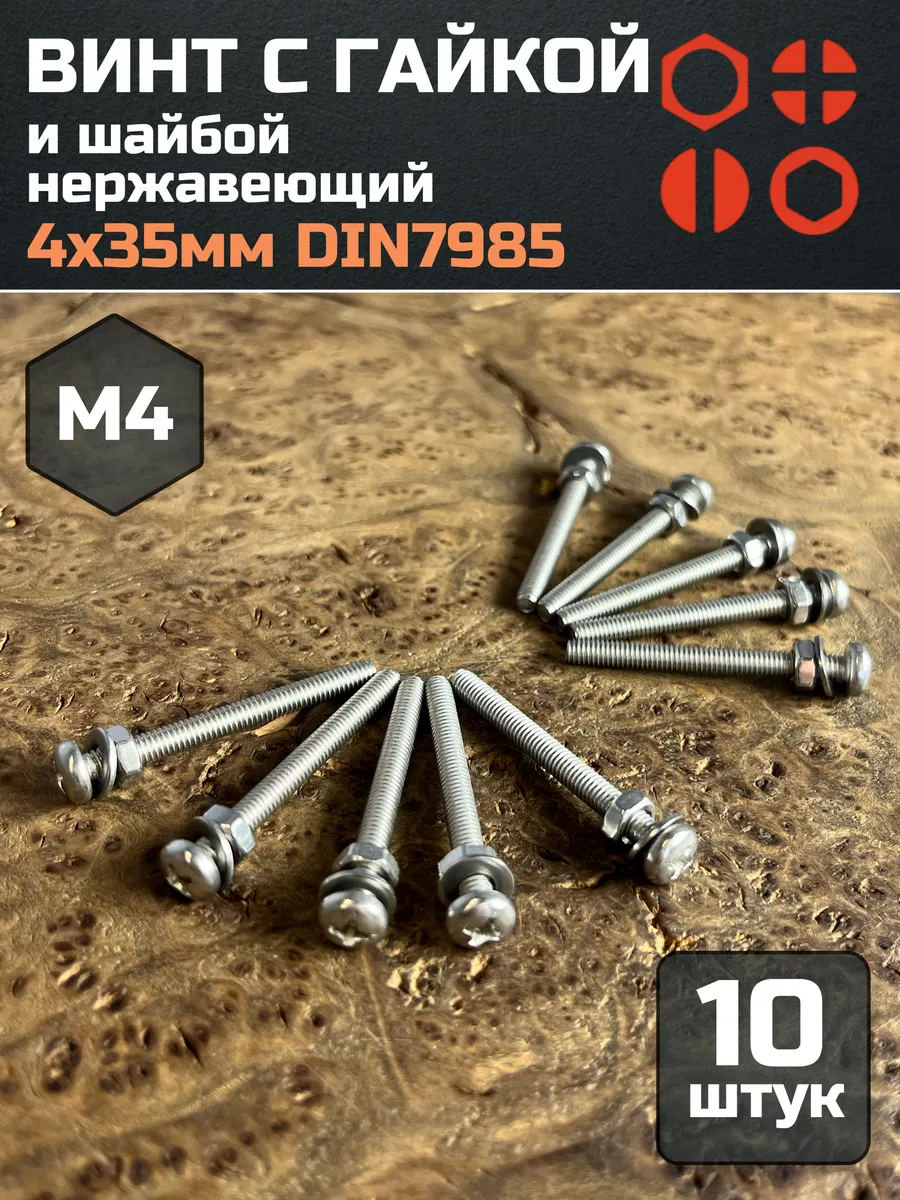 Винт нержавеющий с гайкой и шайбой 4х35 мм DIN7985, 10 шт.