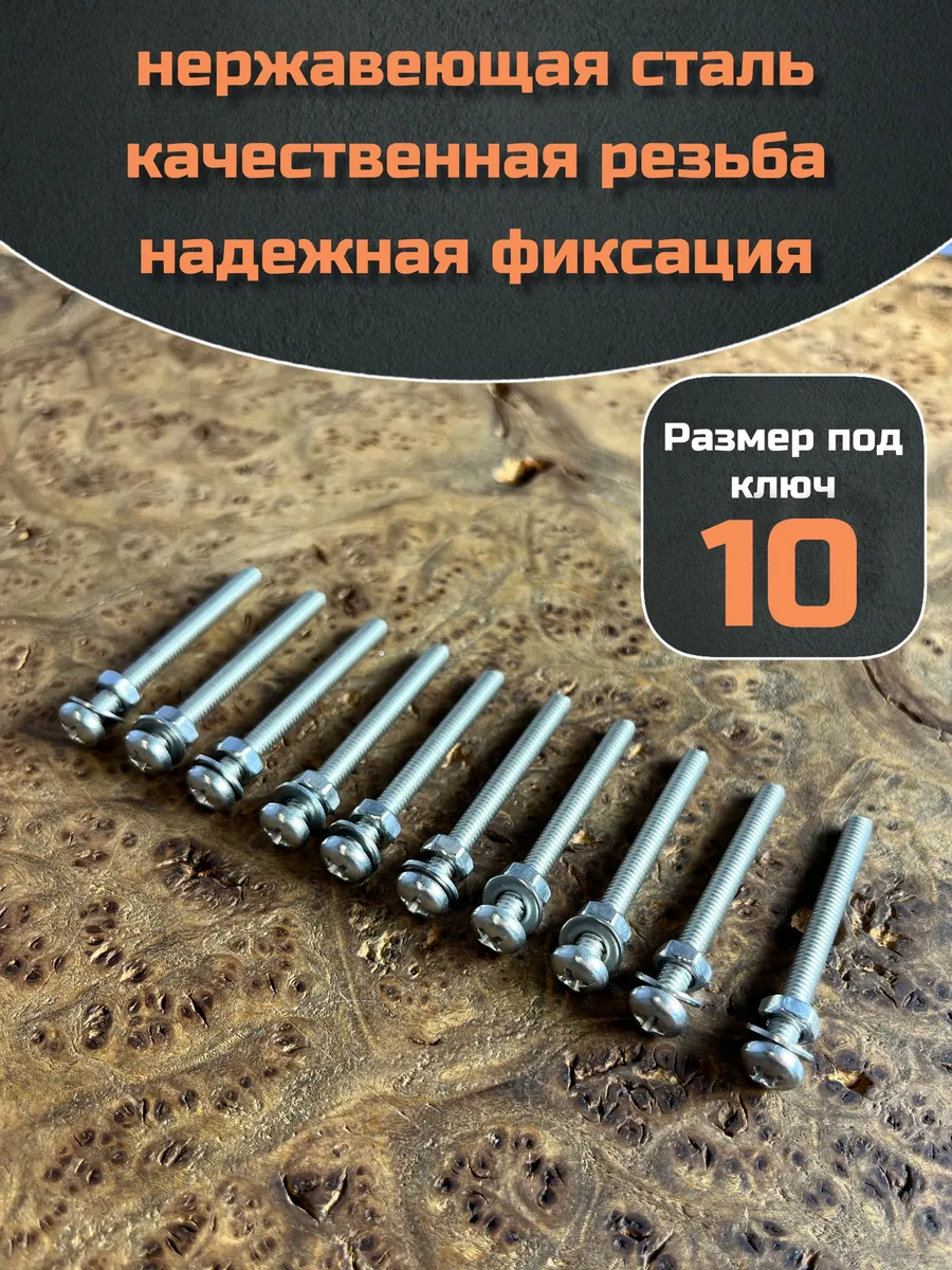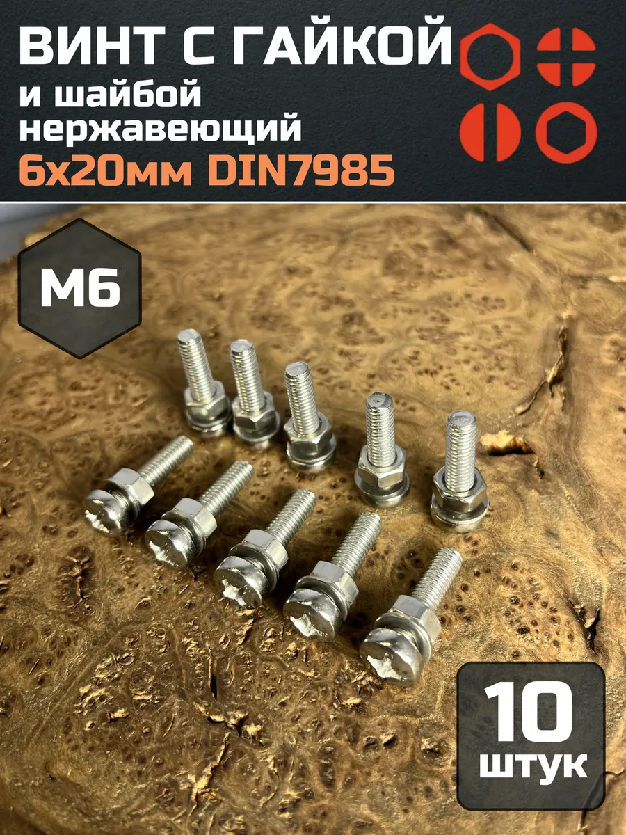 Винт нержавеющий с гайкой и шайбой 6х20 мм DIN7985, 10 шт.