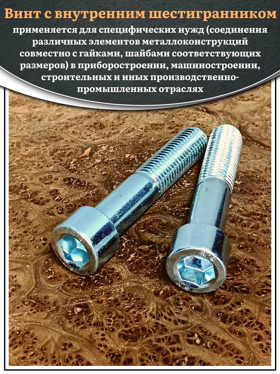 Винт DIN 912 представляет собой металлический стержень с метрической резьбой и головкой цилиндрической формы. Изготовляется из разных материалов, в зависимости от области его применения: сталь 8.8,10.9 или 12,9, сталь с оцинкованным покрытием, нержавеющая сталь А2- А5, латунь, пластик. Прочность на разрыв стали подобного класса достаточно высока, поэтому DIN 912 применяют в конструкциях, которые подвержены серьезным нагрузкам. Применяется винт DIN 912 для специфических нужд (соединения различных элементов металлоконструкций совместно с гайками, шайбами соответствующих размеров) в приборостроении, машиностроении, строительных и иных производственно-промышленных отраслях.
