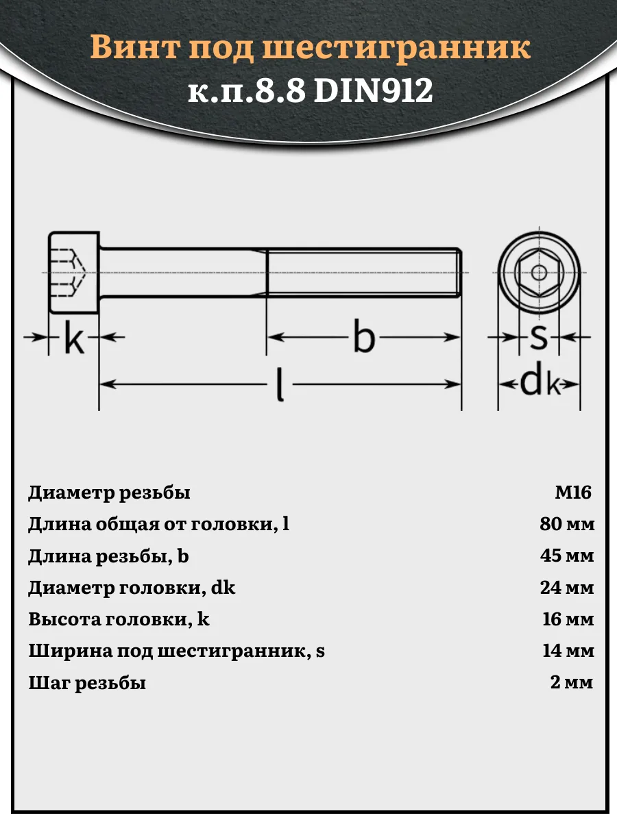 Винт под шестигранник НР 16х80 мм ОЦ к.п.8.8 DIN912, 2 шт.