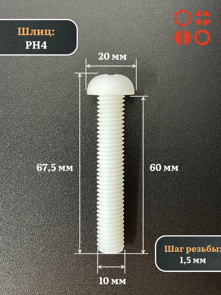 | Винт полиамидный 10х60 мм DIN7985 (пластик), 20 шт. | вп10607985ф20 | 1 шт. |