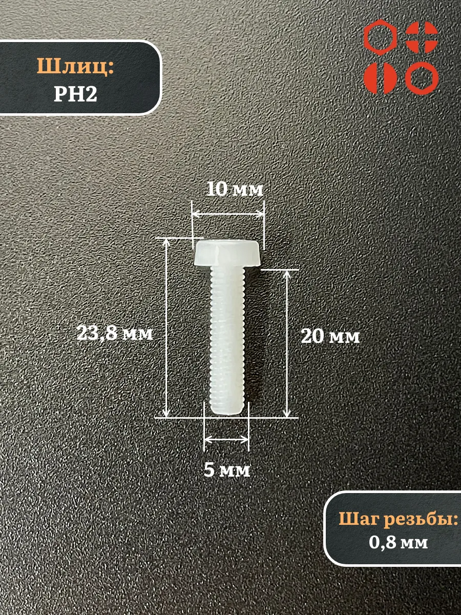 | Винт полиамидный 5х20 мм DIN7985 (пластик), 10 шт. | вп5207985ф10 | 1 шт. |