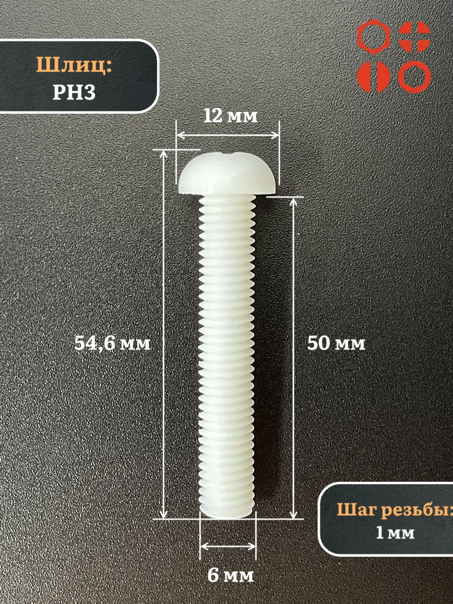 Винт полиамидный 6х50 мм DIN7985 (пластик), 50 шт.
