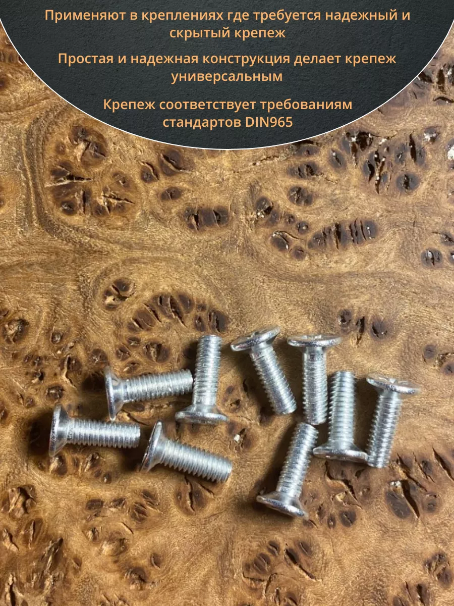 Винт с потайной головкой состоит из головки и стержня с полной резьбой, нарезанной по всей длине шпильки, не имеющего заострения на конце, предназначен для соединения деталей. Монтаж может быть сквозным или глухим. Головка утапливается в материал или конструкцию, не оставаясь на поверхности. Винты DIN 965 используются в строительстве, машиностроении, промышленных и производственных отраслях совместно с шайбами, гайками соответствующих размеров.